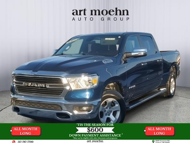 This <b>2019 Ram 1500 Big Horn/Lone Star</b> has a Granite Crystal Metallic Clearcoat exterior and a Diesel Gray/Black interior color. 101021 miles. Stock Number A1384A. You can connect with us by calling 517-787-7700. <b>IMPORTANT PACKAGE INFORMATION:</b><h4 class="vc_build_package_name">Quick Order Package 23Z Big Horn/Lone Star</h4><ul class="vc_build_package_item_list"><li>Steering Wheel Mounted Audio Controls</li></ul><h4 class="vc_build_package_name">Big Horn Level 1 Equipment Group ($1 200 value)</h4><ul class="vc_build_package_item_list"><li>Foam Bottle Insert (door Trim Panel)</li><li>Rear Window Defroster</li><li>Rear Power Sliding Window</li><li>Sun Visors with Illuminated Vanity Mirrors</li><li>Rear View Auto Dim Mirror</li><li>Power Heated Fold Away Mirrors</li><li>Cluster 3.5" TFT Color Display</li><li>Power 4-Way Driver Lumbar Adjust</li><li>Power 8-Way Driver Seat</li><li>Glove Box Lamp</li><li>Rear Dome with On/off Switch Lamp</li><li>Big Horn Instrument Panel Badge</li><li>Single Disc Remote CD Player</li><li>SiriusXM Satellite Radio</li><li>Uconnect 4 Radio with 8.4" Display</li><li>Power Adjustable Pedals</li><li>Class IV Receiver Hitch</li><li>Universal Garage Door Opener</li></ul><h4 class="vc_build_feature_name">Comfort</h4><ul class="vc_build_feature_item_list"><li> The seating surfaces are covered in cloth.</li><li> Driver seat with 4-way directional controls</li><li> The seat provides a variety of adjustments to enhance seating comfort.</li></ul><h4 class="vc_build_feature_name">Technology and Telematics</h4><ul class="vc_build_feature_item_list"><li> Without the need for a manufacturer specific app to be installed on the smart device the vehicle infotainment system can access and control functions of a smart device physically plugged-into the vehicle.</li><li> Otherwise known as Bluetooth this technology allows electronic devices to integrate with the vehicle systems without the need for a physical connection between them.</li></ul><b>ADDITIONAL FEATURES:</b><b>If you decide to speak with one of our knowledgeable associates - please reference this Stock number A1384A. Connect with us now by calling .</b>This Ram has gone through our service process - You can request the full inspection at anytime. <b>HONEST & EASY CAR BUYING</b>Buying a vehicle can be a stressful experience and we understand that. That's why we've built our business on earning your trust and to make you feel financially protected. Through our trusted car-buying process you'll have access to full service reports and vehicle history checks. Furthermore we are a KBB brand top-rated dealer. A Cargurus 4-1/2 star dealer and we have over 1 000 Google reviews! Choose Art Moehn Auto Group today and come see how easy buying a car can be.