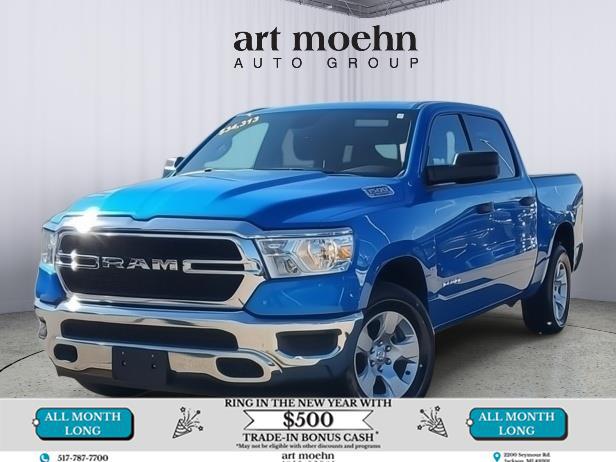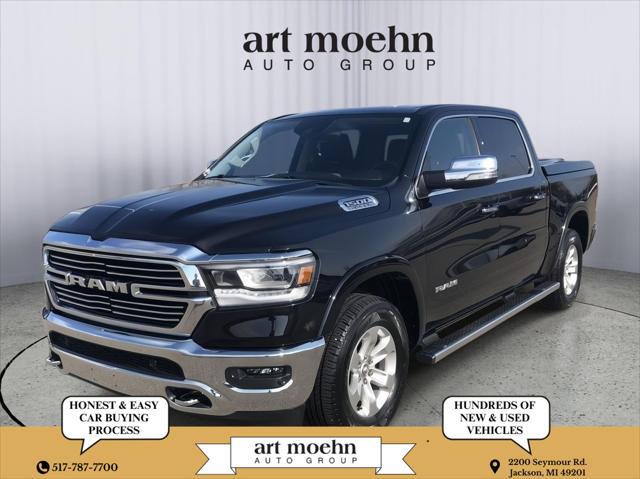 This <b>2022 Ram 1500 Laramie</b> has a Diamond Black Crystal Pearlcoat exterior and a Black interior color. 64236 miles. Stock Number 72507A. You can connect with us by calling 517-787-7700. <b>IMPORTANT PACKAGE INFORMATION:</b><h4 class="vc_build_package_name">Chrome Appearance Group ($1 095 value)</h4><ul class="vc_build_package_item_list"><li>Bright Day Light Opening Moldings</li><li>Wheel to Wheel Side Steps</li><li>Chrome Tow Hooks</li></ul><h4 class="vc_build_package_name">Quick Order Package 25H Laramie</h4><ul class="vc_build_package_item_list"></ul><h4 class="vc_build_package_name">Laramie Level B Equipment Group ($3 795 value)</h4><ul class="vc_build_package_item_list"><li>Rear 60/40 Folding Split Recline Seat</li><li>Rear Underseat Compartment Storage</li><li>Foam Bottle Insert (door Trim Panel)</li><li>Rain Sensitive Windshield Wipers</li><li>Remote Tailgate Release</li><li>Heated Second Row Seats</li><li>Auto High Beam Headlamp Control</li><li>Harman/kardon 19 Speaker Premium Sound</li><li>Uconnect 5 Navigation Radio with 8.4" Display</li><li>ParkSense Front/rear Park Assist with Stop</li></ul><h4 class="vc_build_feature_name">Comfort</h4><ul class="vc_build_feature_item_list"><li> Ventilated seats offer warm weather comfort by cooling areas of the occupant's body not exposed to the air conditioning system.</li><li> The steering wheel rim is heated.</li></ul><h4 class="vc_build_feature_name">Convenience</h4><ul class="vc_build_feature_item_list"><li> The keyfob has the ability to remotely start the vehicle's engine.</li></ul><h4 class="vc_build_feature_name">Safety and Security</h4><ul class="vc_build_feature_item_list"><li> The vehicle is equipped with a system that senses and then prepares the vehicle and/or occupants for an impending forward collision.</li></ul><h4 class="vc_build_feature_name">Technology and Telematics</h4><ul class="vc_build_feature_item_list"><li> The vehicle is equipped with a built-in voice activated navigation system.</li></ul><b>ADDITIONAL FEATURES:</b><b>If you decide to speak with one of our knowledgeable associates - please reference this Stock number 72507A. Connect with us now by calling 517-787-7700.</b>This Ram has gone through our service process - You can request the full inspection at anytime. <b>HONEST & EASY CAR BUYING</b>Buying a vehicle can be a stressful experience and we understand that. That's why we've built our business on earning your trust and to make you feel financially protected. Through our trusted car-buying process you'll have access to full service reports and vehicle history checks. Furthermore we are a KBB brand top-rated dealer. A Cargurus 4-1/2 star dealer and we have over 1 000 Google reviews! Choose Art Moehn Auto Group today and come see how easy buying a car can be.